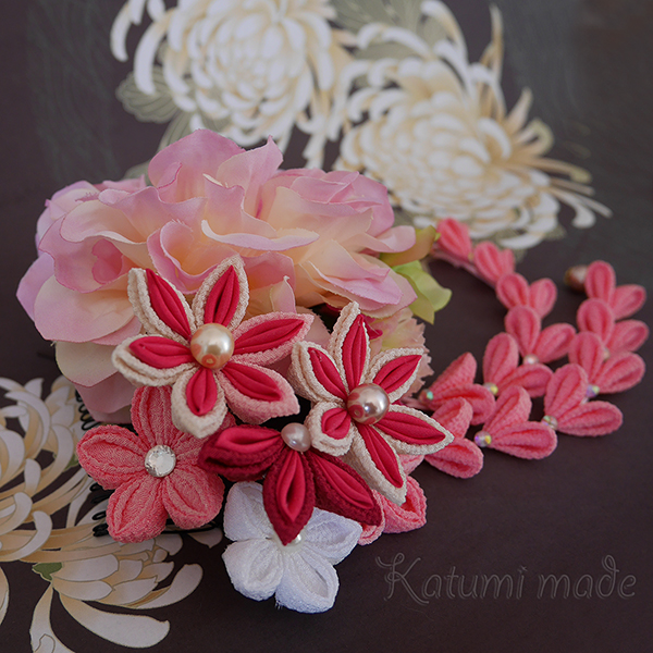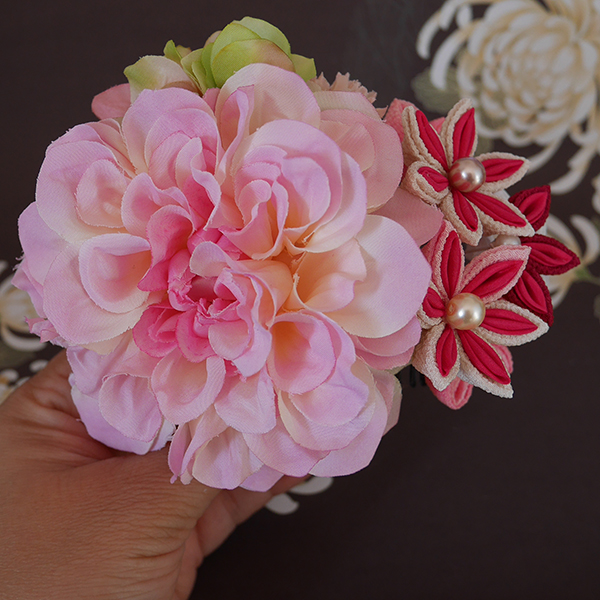 シンプルな1輪に、つまみ細工を組み合わせて艶やかにお使い頂けます。