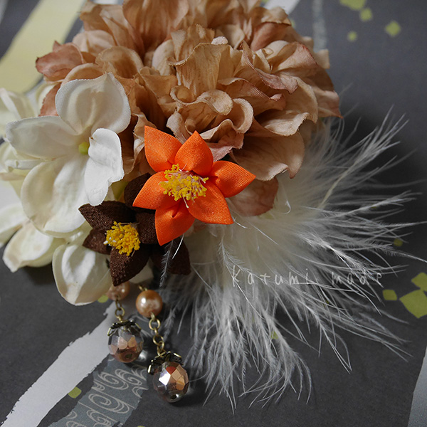 シンプルな1輪に、つまみ細工を組み合わせて艶やかにお使い頂けます。