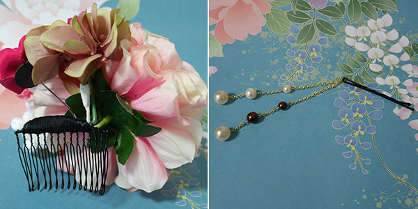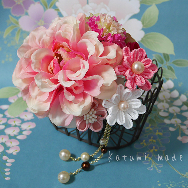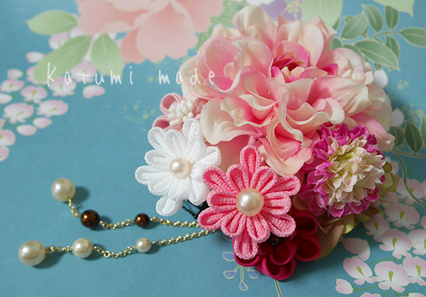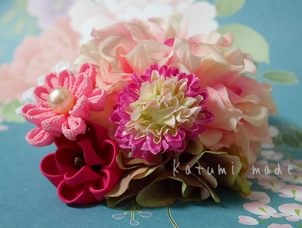 シンプルな1輪に、つまみ細工を組み合わせて艶やかにお使い頂けます。