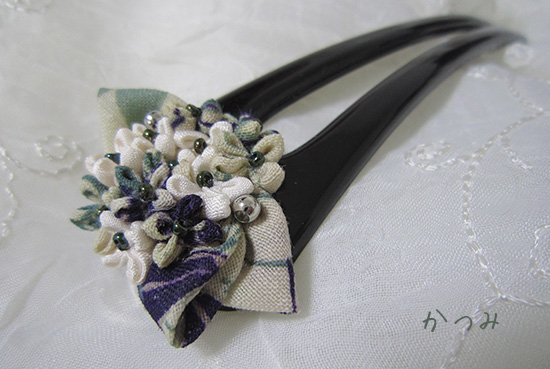 モスリン古布の柄生地と正絹古布の白で紫陽花を模した簪。