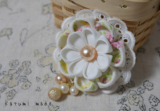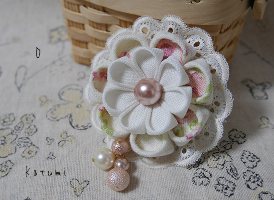 つまみ細工のブローチ(完成品)>リネンのブローチ