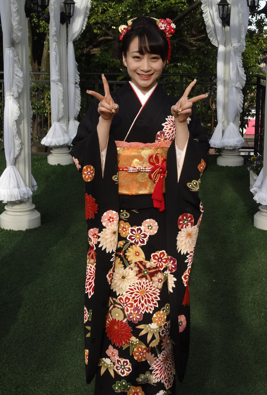 成人式のお着物姿です、黒のお着物に赤ベースの簪が小粋で素敵です。