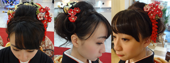 *櫛、平打ち、簪での結った髪飾りです、赤の簪と黒のお櫛の組み合わせが小粋ですね♪
