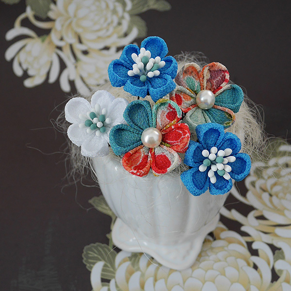 Uピン5本、ひと越しちりめんで作りました、真白とブルー無地とターコイズブルーの古典柄。