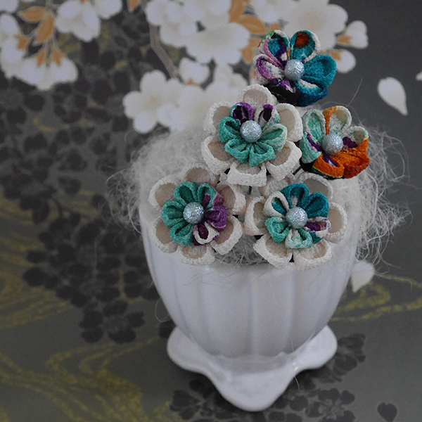 一越ちりめんで縫いつまみ細工のUピンに仕上げました。