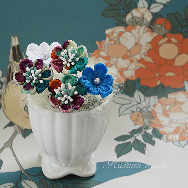 一越ちりめんで縫いつまみ細工のUピンに仕上げました。