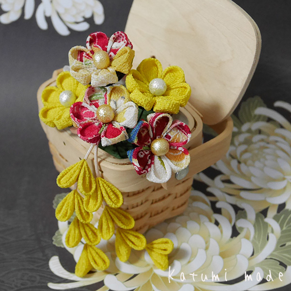 ba05つまみ細工のUピン5点セット菜花*下がり付