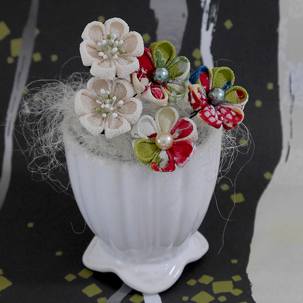 一越ちりめん古典柄やちりめん柄でで縫いつまみ細工のUピンに仕上げました。