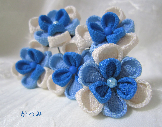 一越ちりめんの青、水色の2色と生成りで作りました、 1つのお花の幅は3センチ弱、