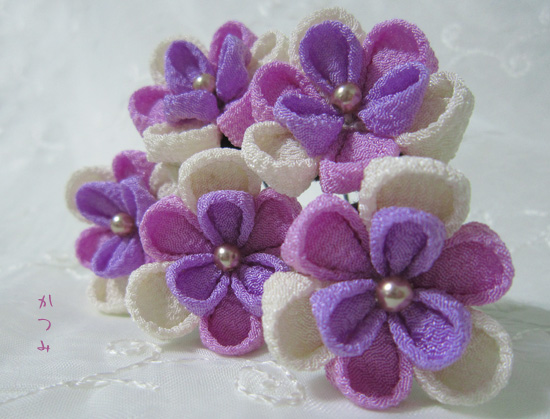 一越ちりめんの明るい紫系の2色と生成りで作りました、