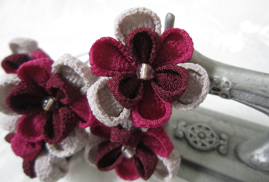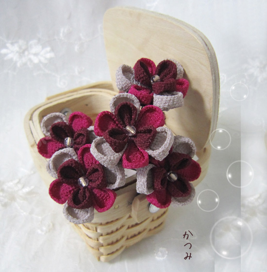 一越ちりめんの、ねず、ワイン、牡丹色のシックな組み合わせ、 1つのお花の幅は3センチ弱、