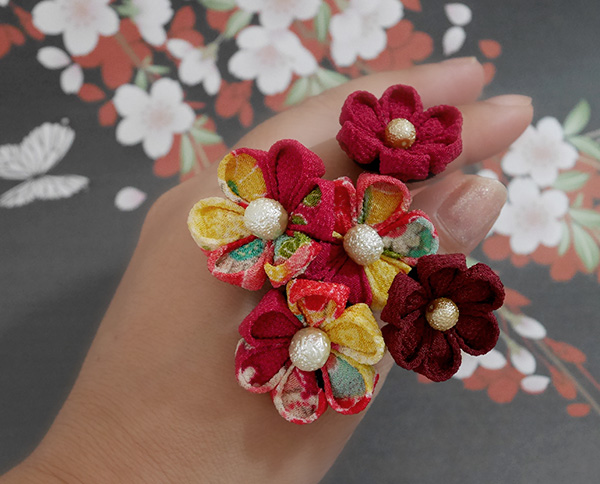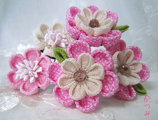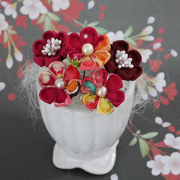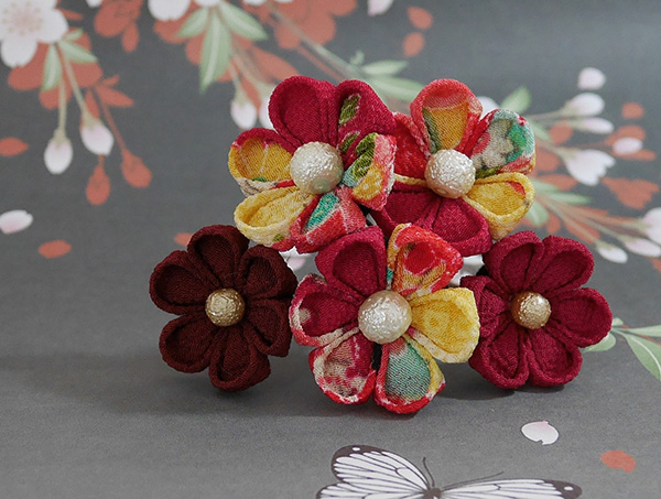 一越ちりめん古典柄やちりめん柄でで縫いつまみ細工のUピンに仕上げました。