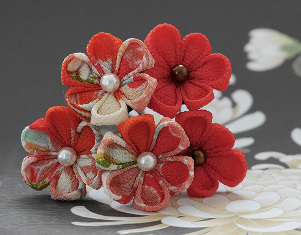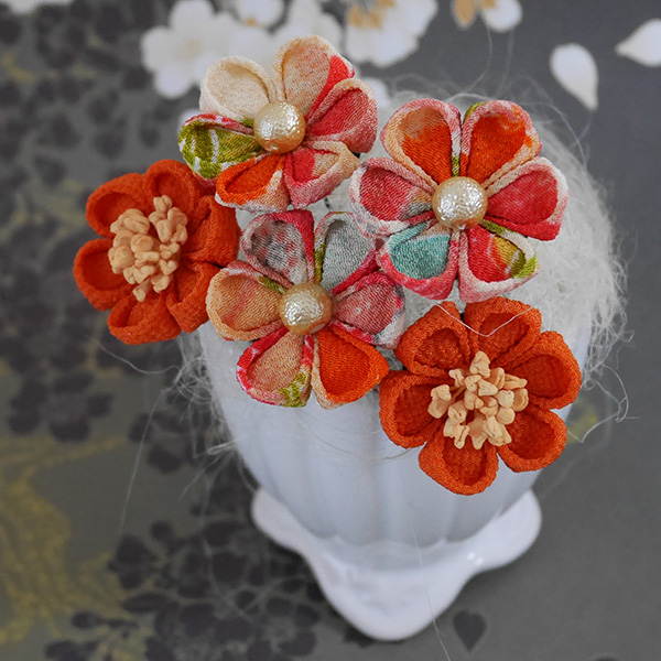つまみ細工のUピン髪飾りセット(朱、オレンジ系)