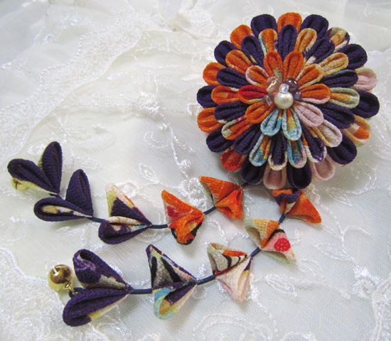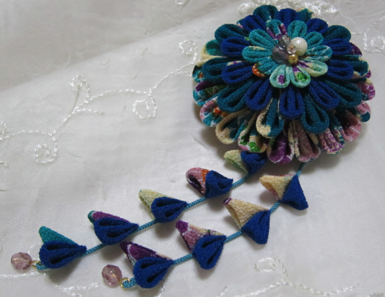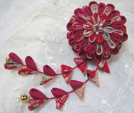 つまみ細工ブローチ>ブローチ大玉下がり付き