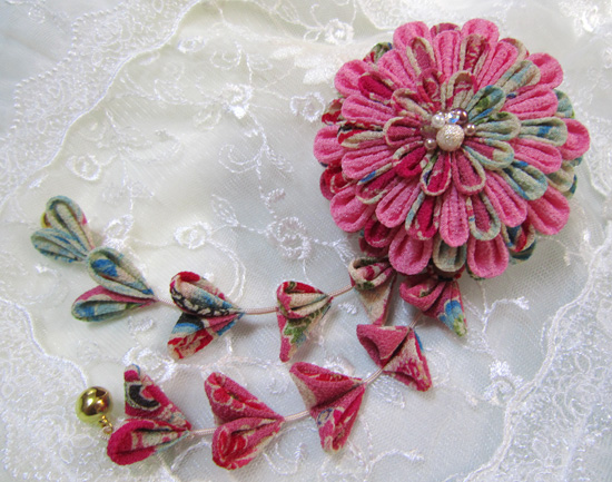 つまみ細工ブローチ>ブローチ大玉下がり付き