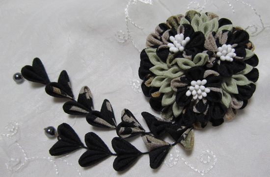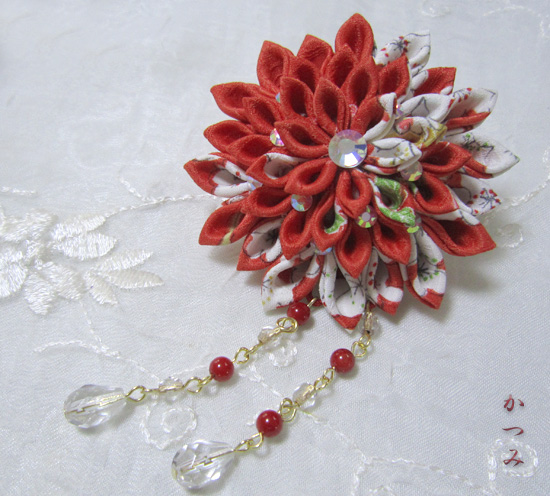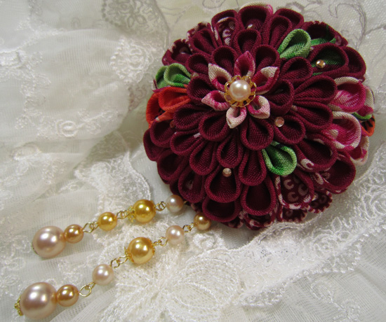 つまみ細工ブローチ>ブローチ大玉下がり付き