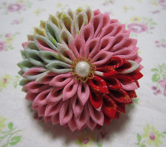 つまみ細工のブローチ大玉下がり付き