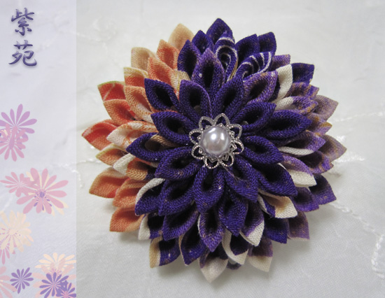 つまみ細工ブローチ>ブローチ古布、青、紫系