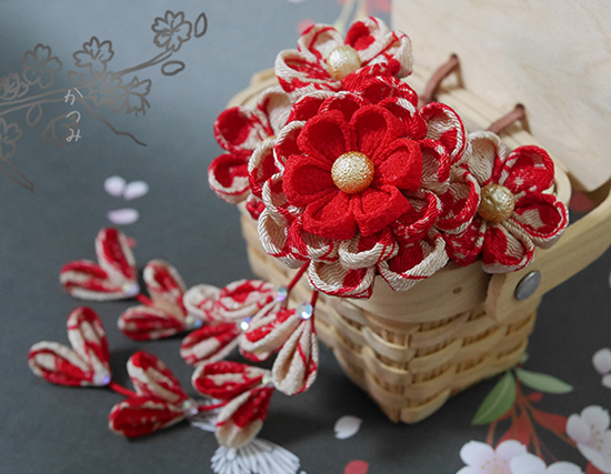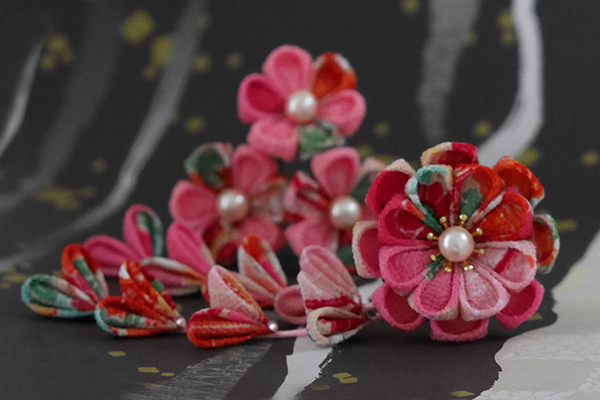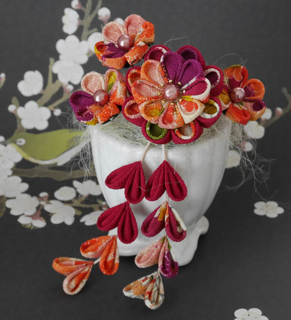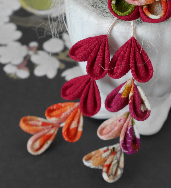 古典柄一越ちりめん等で縫いつまみの髪飾りに仕上げました。