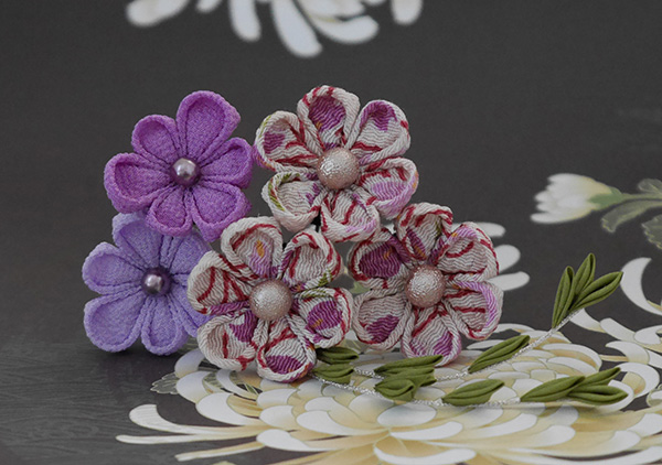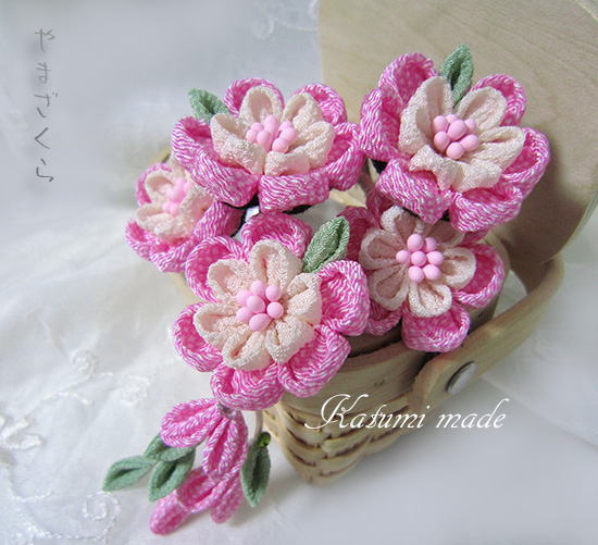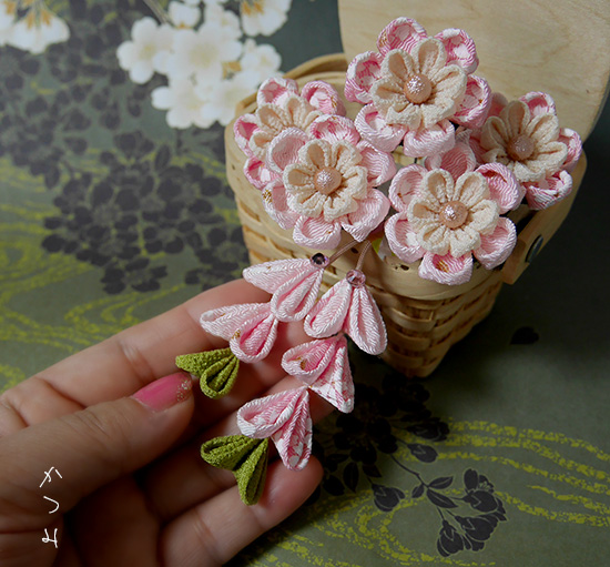 af11つまみ細工のUピン5本セットやまざくら、さがり付き