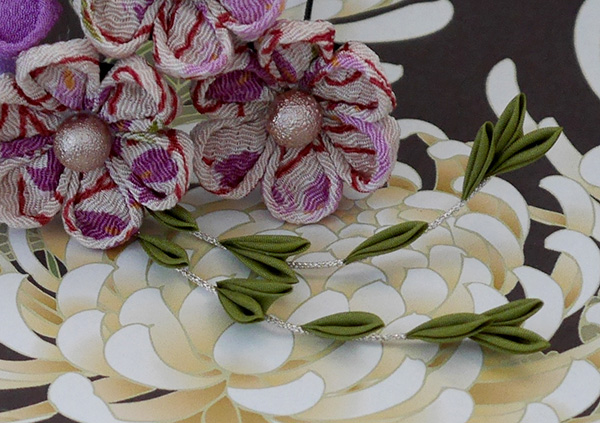 柄ちりめんと一越ちりめんの無地の組み合わせ、下がりの葉は正絹羽二重です。