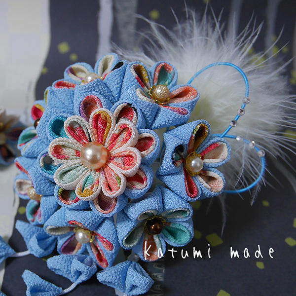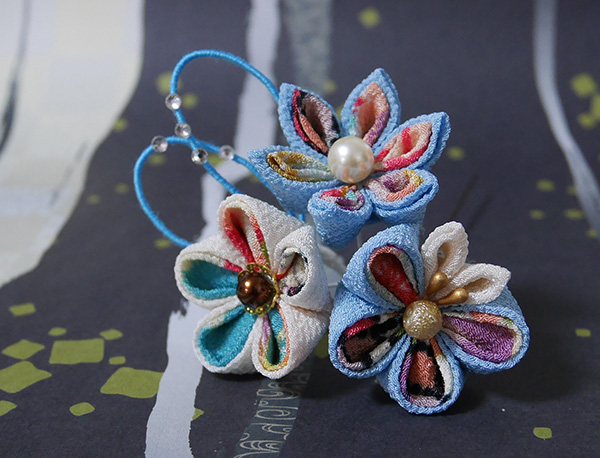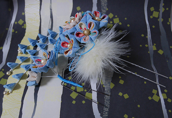 つまみ細工の簪(かんざし)下がり付き、ブルー系