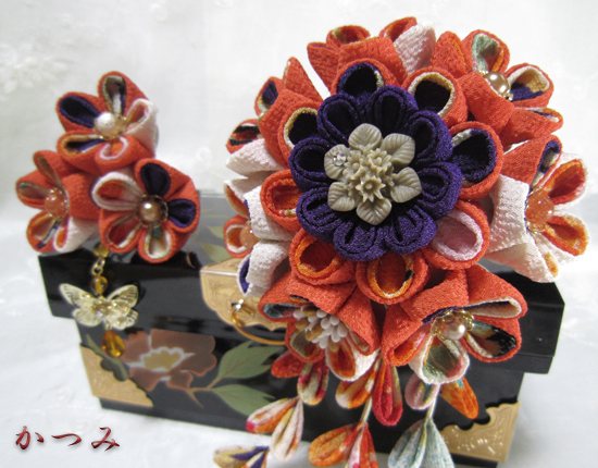 つまみ細工の簪(かんざし)下がり付き、オレンジ