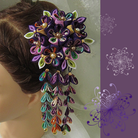 つまみ細工の簪(かんざし)下がり付き、紫系