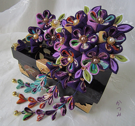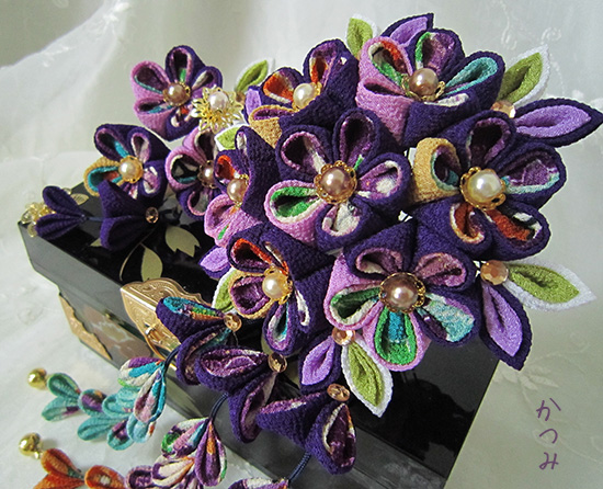 一越ちりめんの江戸紫主体の簪です、柄生地も人越しちりめんです、
