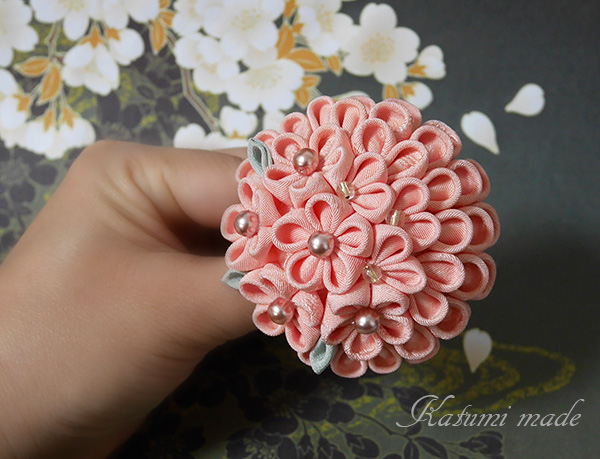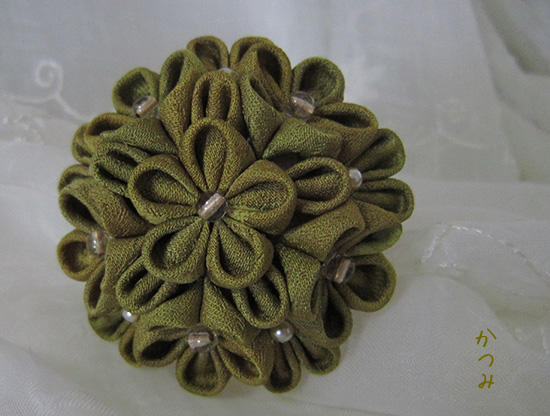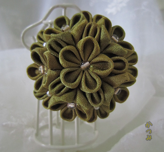 正絹古布で丸つまみUピン仕立にしました、祖母のお着物の残布です、