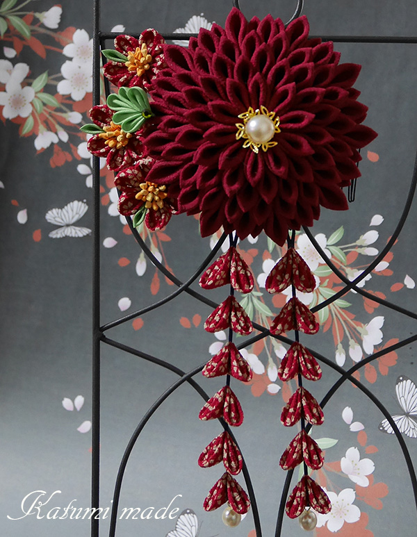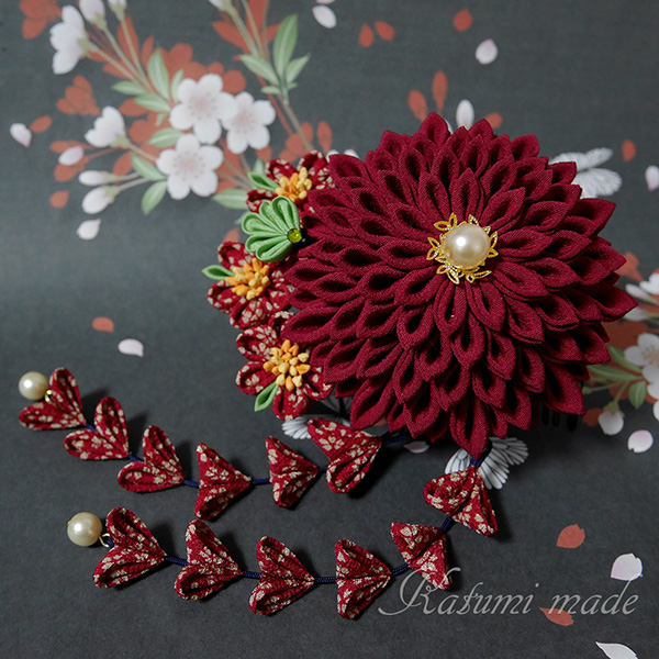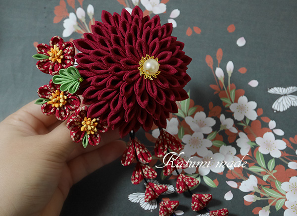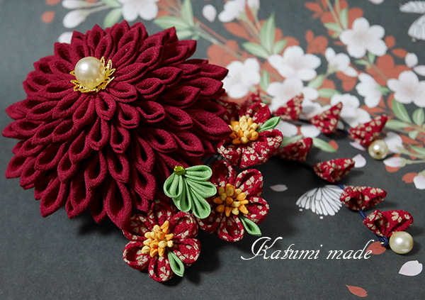 菊花は画像より暗めのエンジ着物古布、柄生地はひと越しちりめん、緑は正絹羽二重、