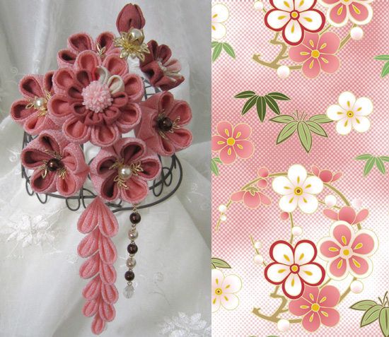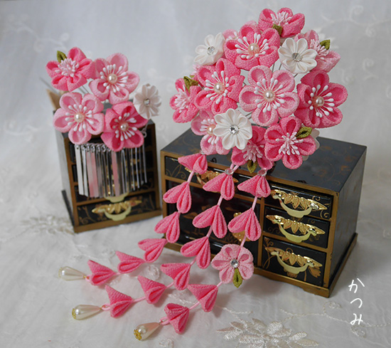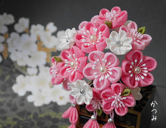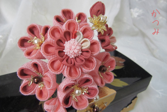 人越しちりめんの2色のピンクと正絹古布の白花の桜を模した簪です、