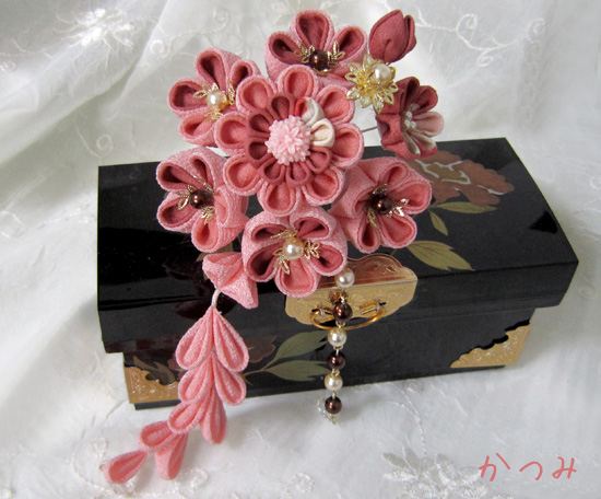 つまみ細工の簪(かんざし)ビラ、下がり付き、ピンク系