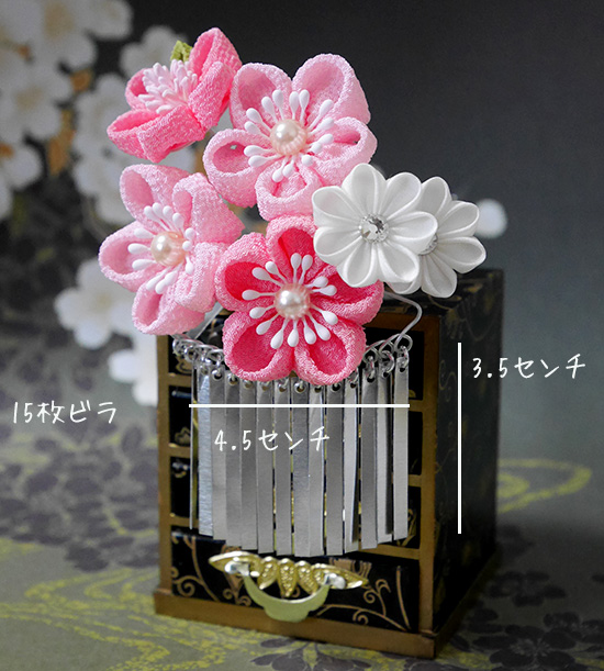 簪下がり付き、お花の横幅9.5センチ、下がりは一番長い方で13.5センチ、