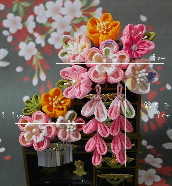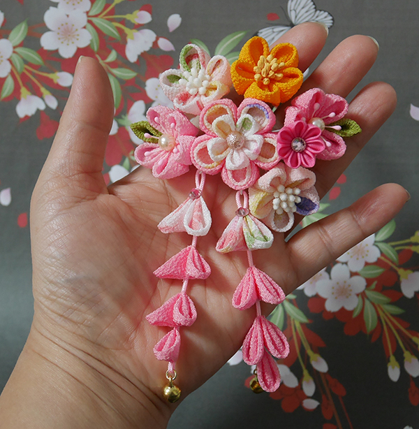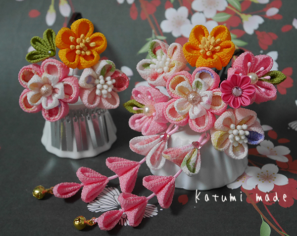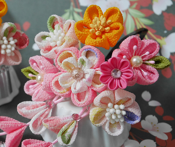 一越ちりめんの無地の桃、薄桃、オレンジ、一越しの柄生地で元気いっぱいの簪、一部正絹羽二重、