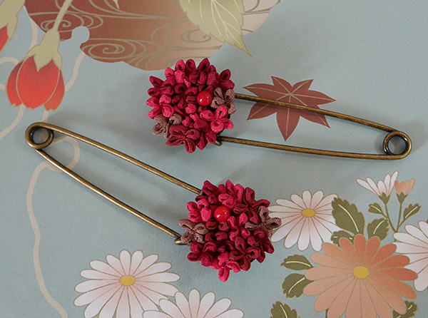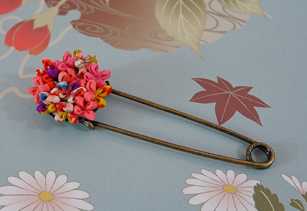 古布でストールピンに仕立てました、かなりアンティーク感ありありの生地です、