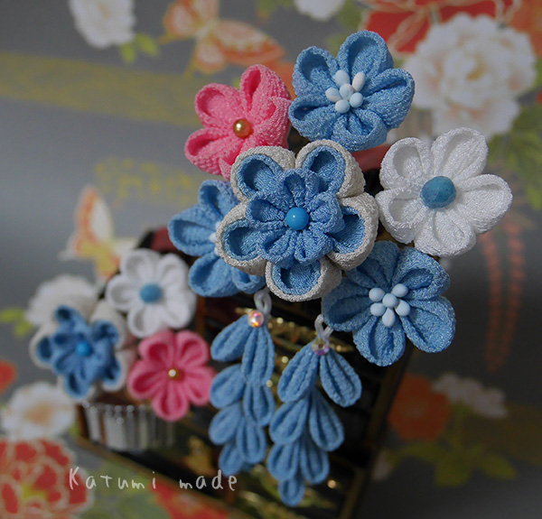一越ちりめんの無地桃、薄桃、水色、真白、生成りで作りました、三歳用としての七五三の髪飾りです。