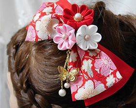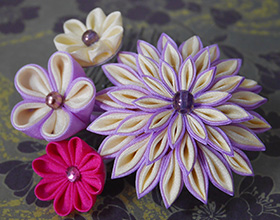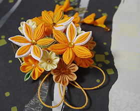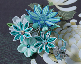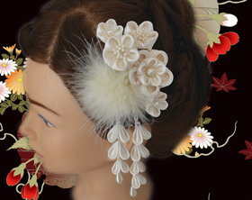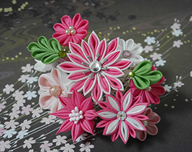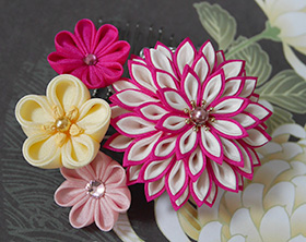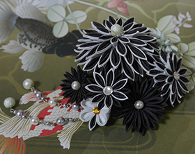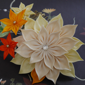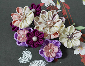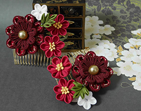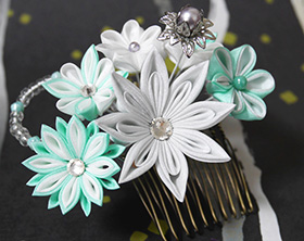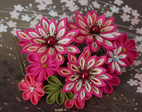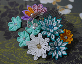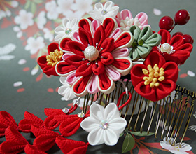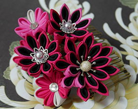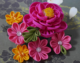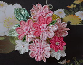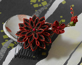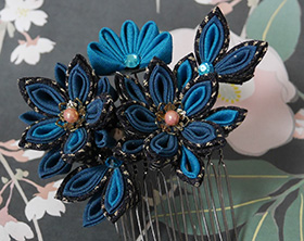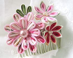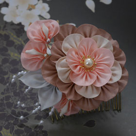 丸つまみ、剣つまみ細工のヘアコーム飾り。 髪に留め付ける際は花芯や花びらに力がかからないように金具を持ってお付けくださいね。