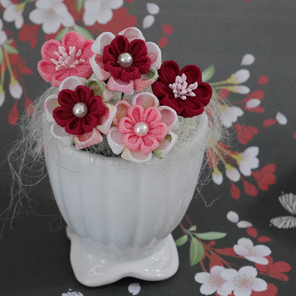 一越ちりめん古典柄やちりめん柄でで縫いつまみ細工のUピンに仕上げました。
