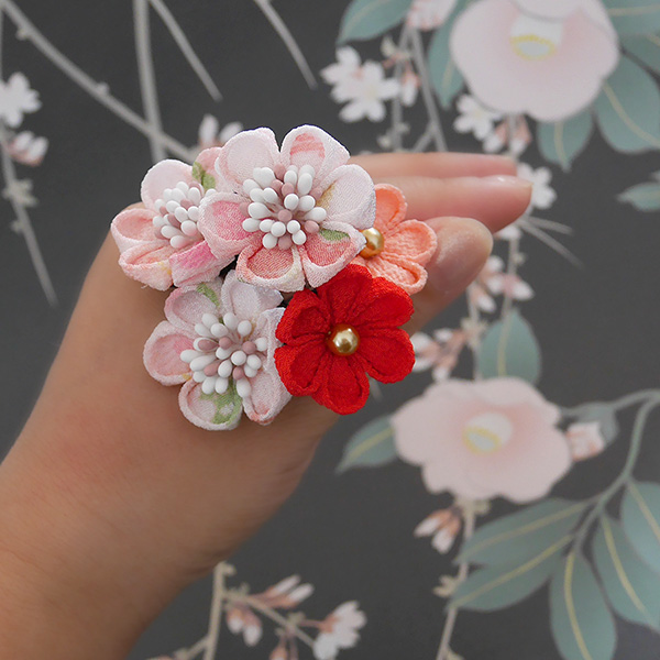 Uピンのお花の5本セット、柄生地、無地とも一越ちりめんです、